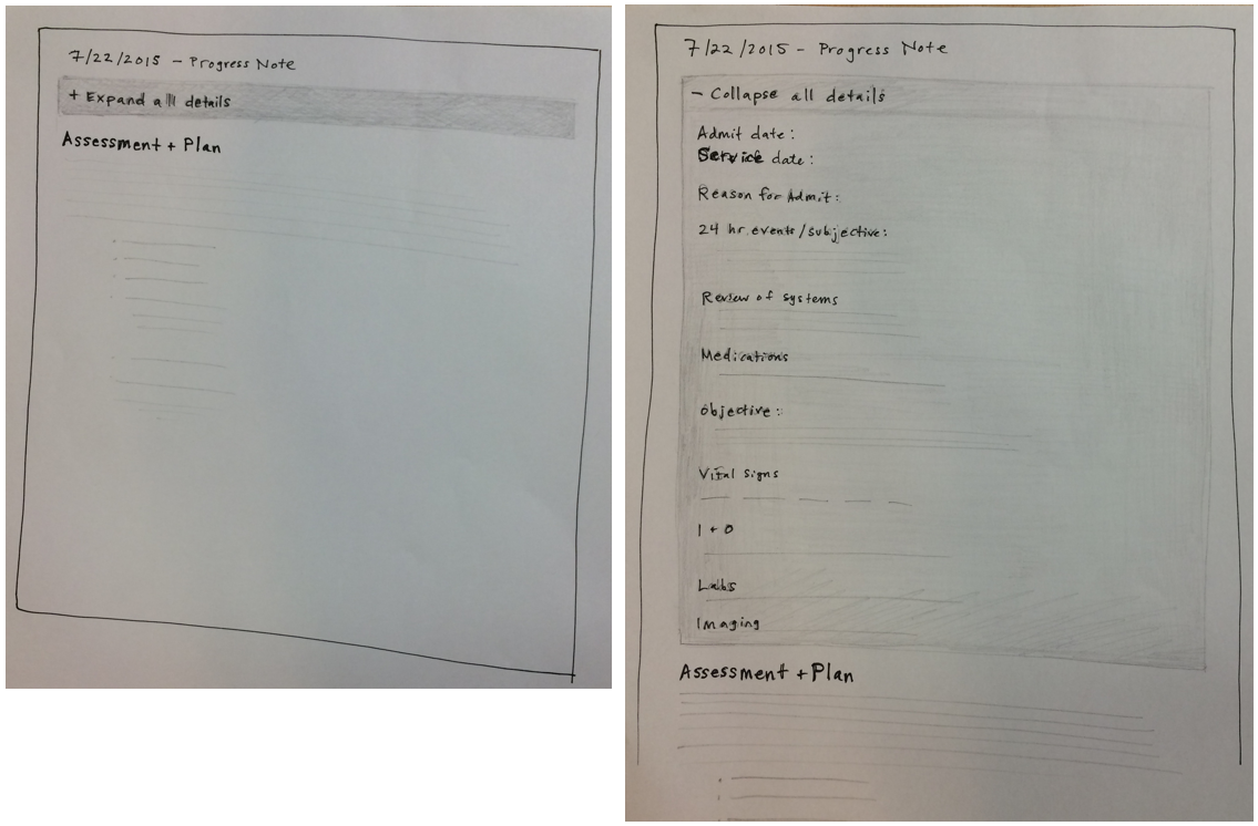 First, I had a chance to sketch out potential solutions with residents in 1-on-1 meetings. One of the initial meetings included this sketch, of a ‘collapsing’ note that showed only the most important information by default, with the rest available with one click.